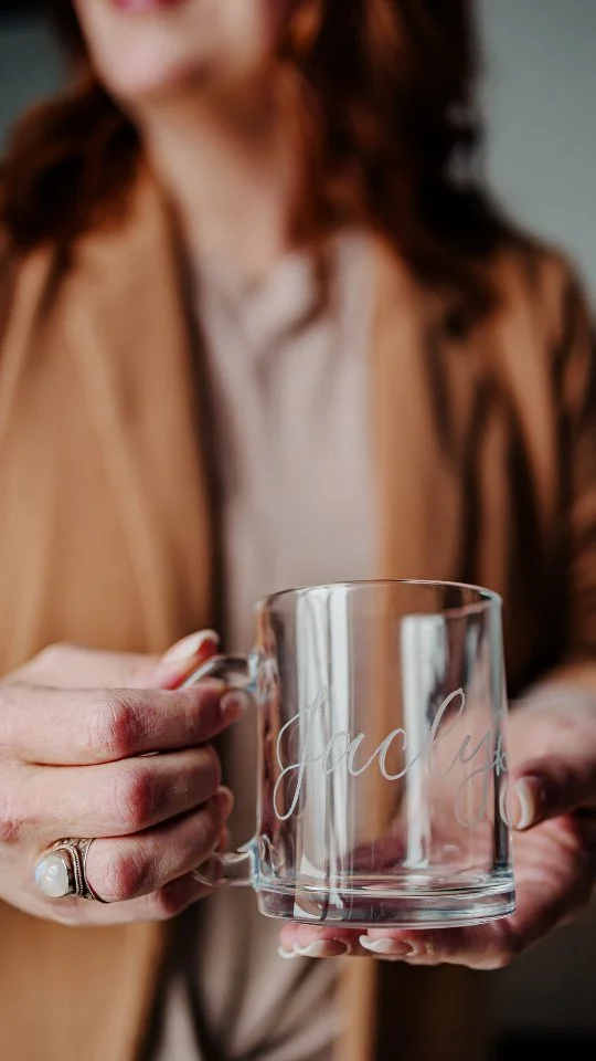 • I set up my packages to include your choice of glassware (which I ship to you in advance or if local, deliver day-of). On the day of the event, I arrive an hour early for set up, and then engrave custom names, initials or sayings on the glasses that your guests will take home!