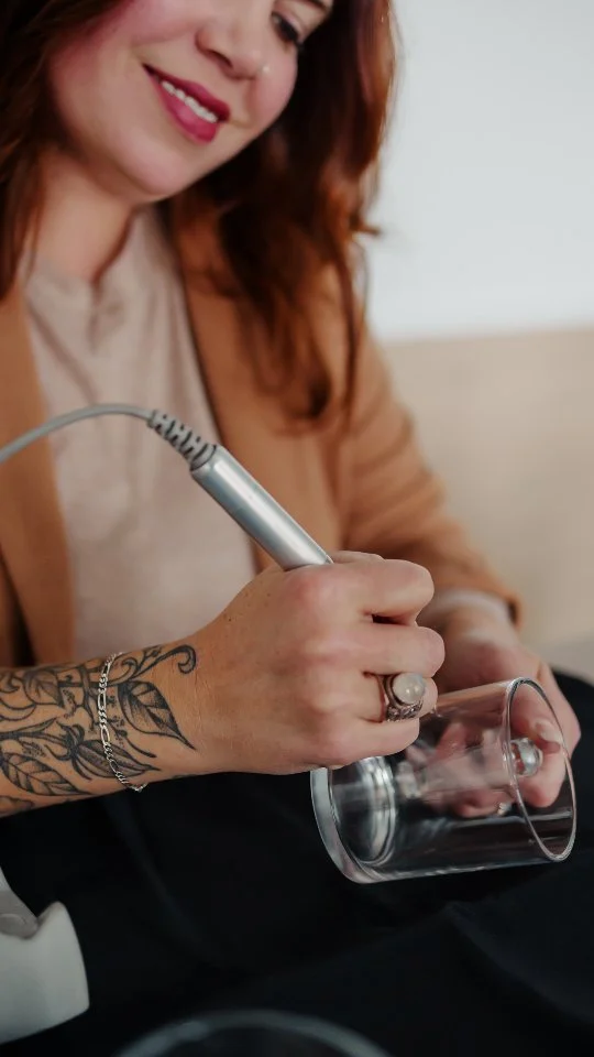 Person using a rotary tool to engrave a glass cup, with a brush and other tools nearby on a dark surface.